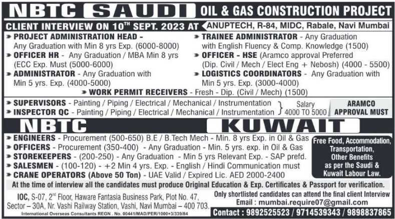 NBTC company vacancies - Hiring for Saudi Arabia & Kuwait