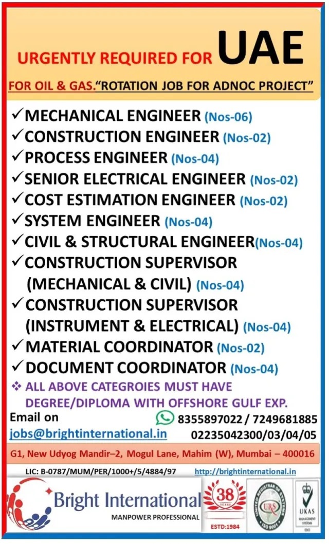 Email : jobs@brightinternational.in / Contacts : 8355897022, 7249681885, 022 35042300, 03, 04, 05