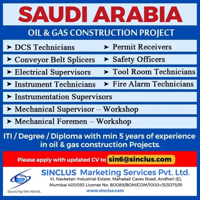 ITI / Degree / Diploma with minimum 5 years of experience in Oil & Gas Construction Projects.