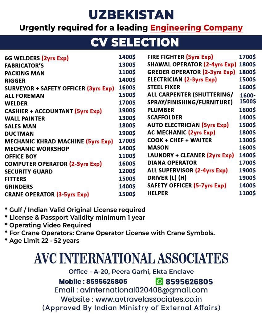 Experience candidates required, Gulf / Indian Valid Original License required. License & Passport Validity minimum 1 year. Operating Video Required. For Crane Operators : Crane Operator License with Crane Symbols. Age Limit 22 to 52 years