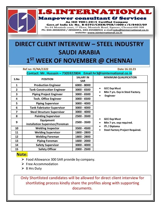 Email : hr3@isinternational.co.in / Contacts : Mr. Hussain : 7305922804