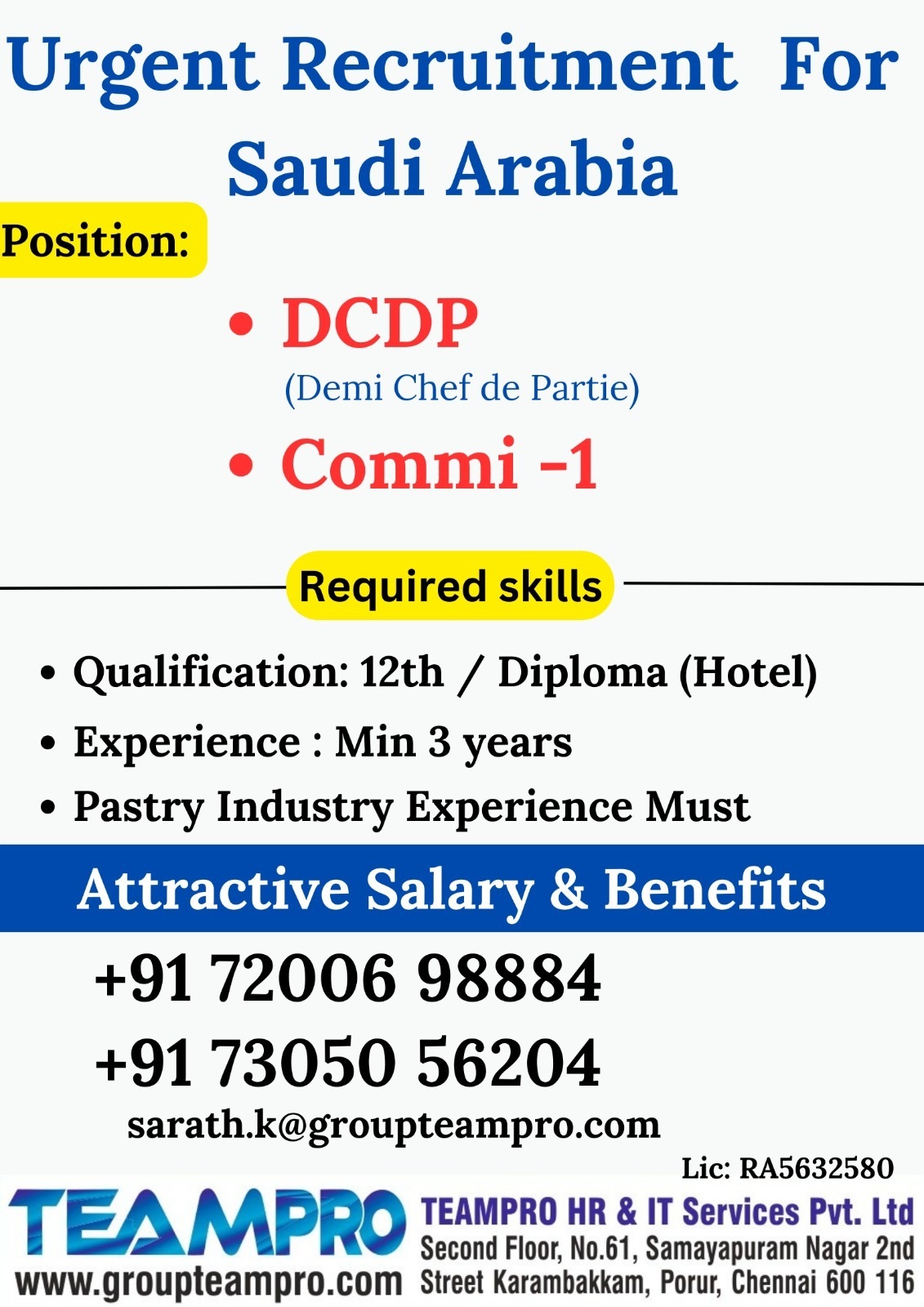 Qualification 12th / Diploma (Hotel), Minimum 3 years experience and Pastry Industry Experience must.