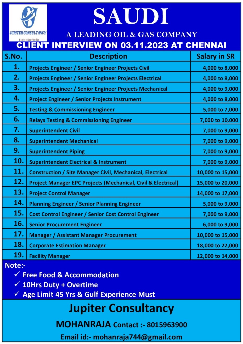 Superintendent Electrical & Instrument | 9000 SAR | |