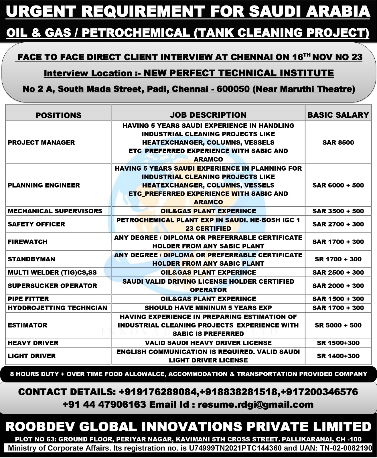 Recruitment to KSA - Oil & Gas Tank Cleaning Project