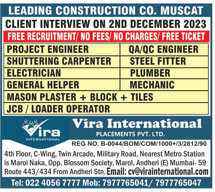 Email : cv@virainternational.com / Contacts : 022 40567777, 7977765041, 7977765047