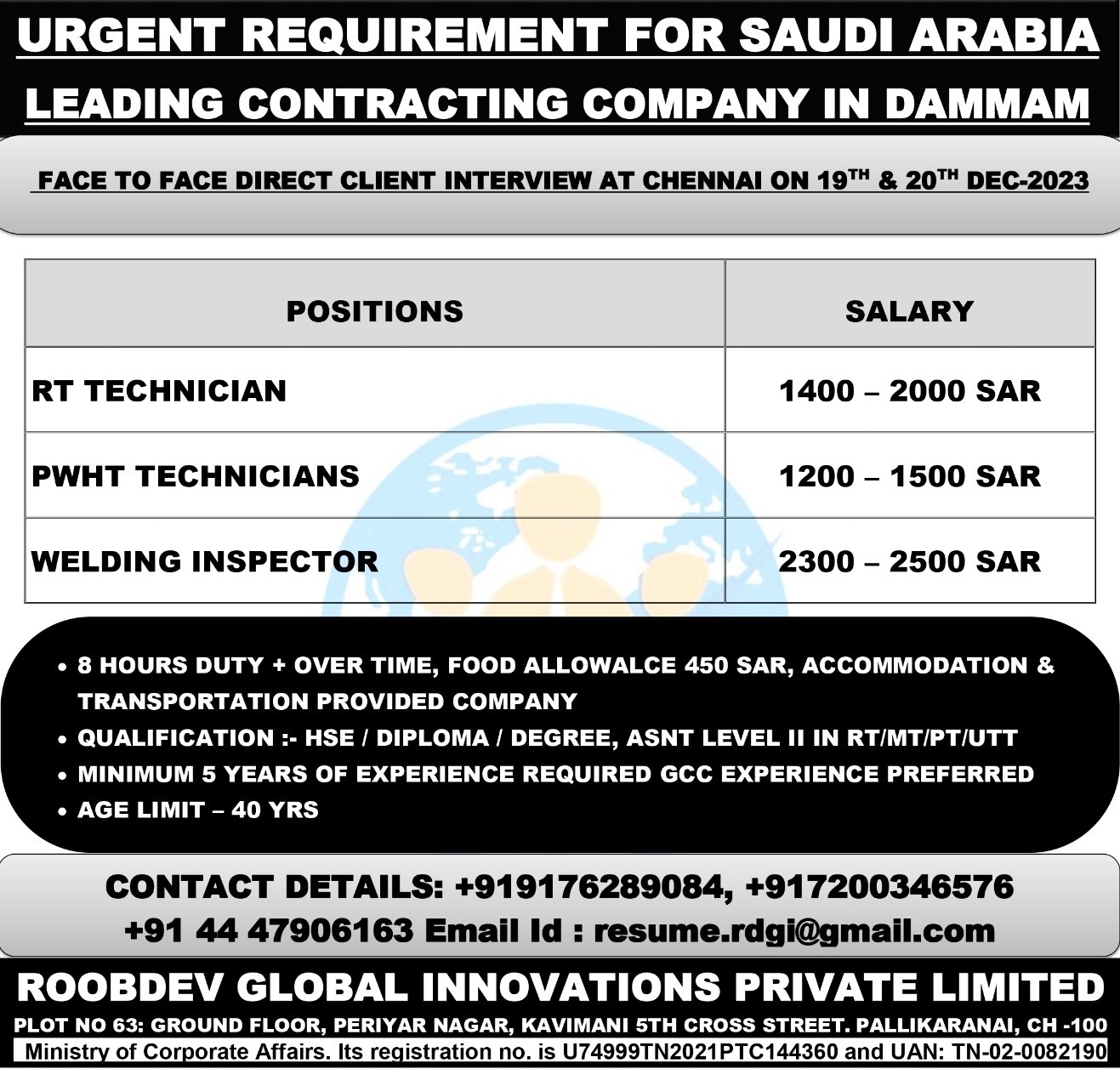 HSE / Diploma / Degree / ASNT Level II in RT/MT/PT/UTT. Minimum 5 years of experience required GCC experience preferred. Age limit 40 years