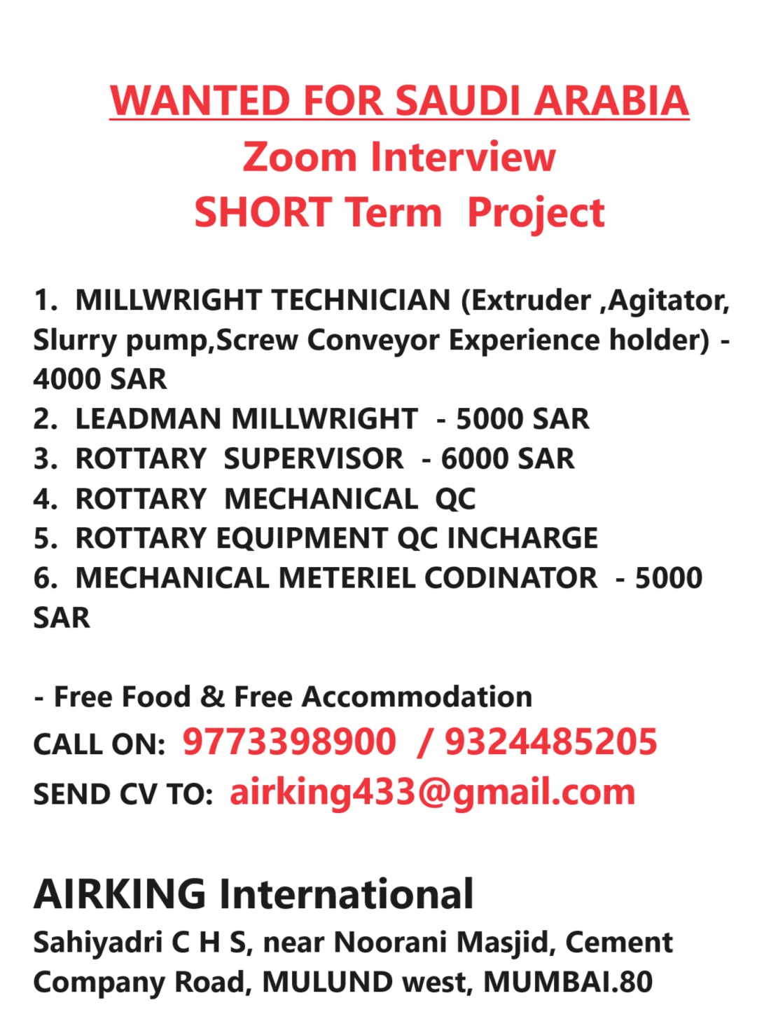 | Millwright Technician (Extruder/Agitator/Slurry Pump/Screw Conveyor) | 4000 SAR | |