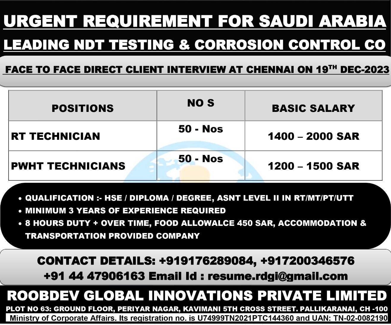 HSE / Diploma / Degree / ASNT Level II in RT/MT/PT/UTT. Minimum 3 years of experience required.