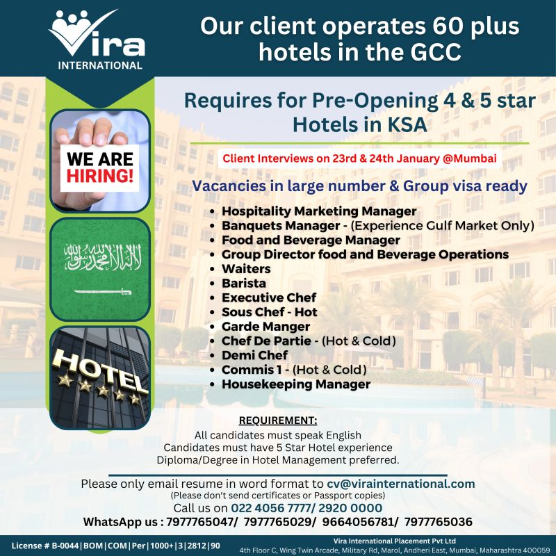 Email : cv@virainternational.com / Contacts : 022 40567777, 29200000, 7977765047, 7977765029, 9664056781, 7977765036 (WhatssApp)