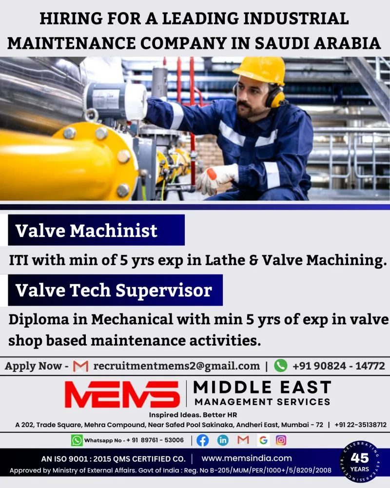Diploma in Mechanical with min 5 yrs of experience in Valve shop based maintenance activties
