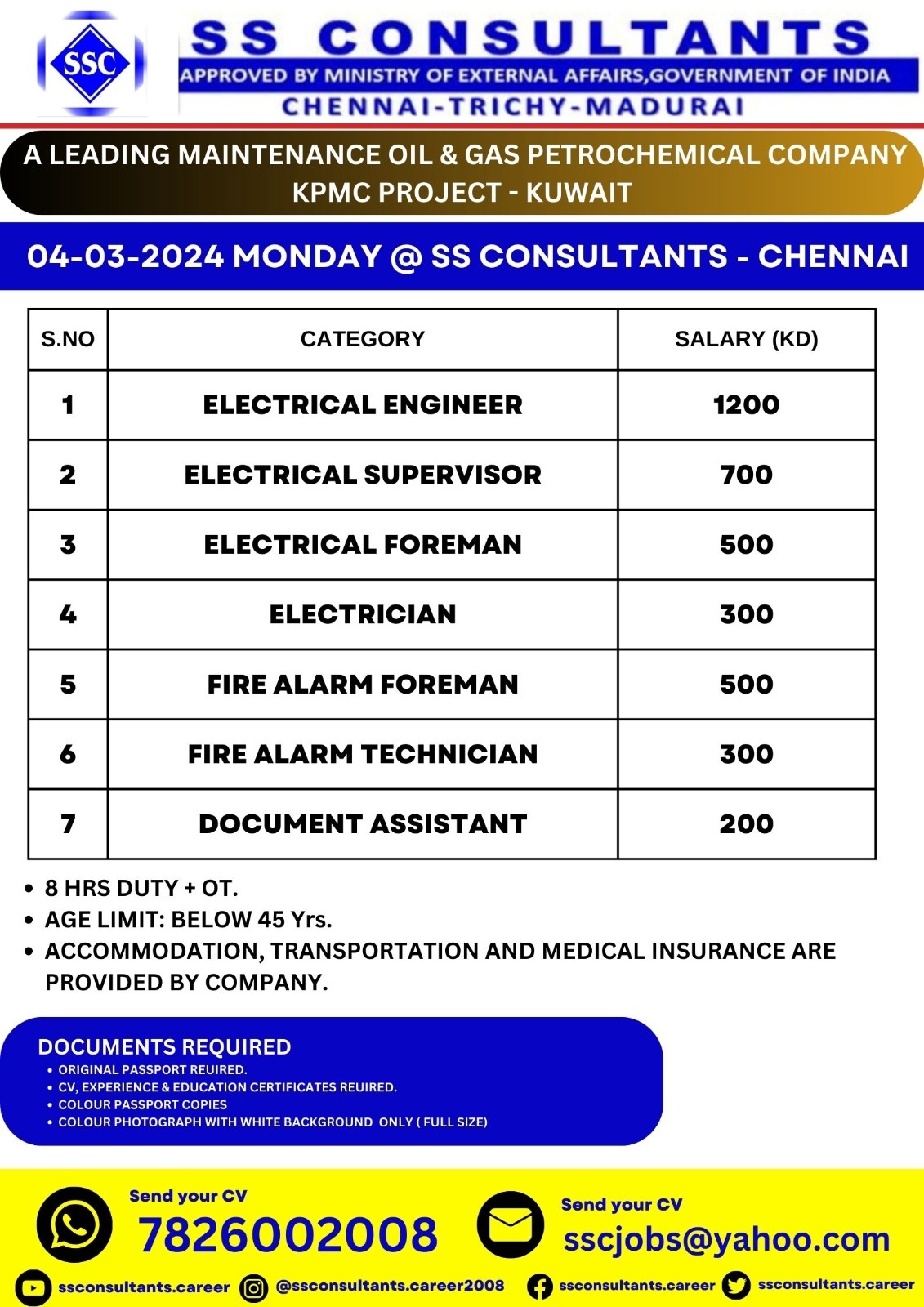 08 hours duty + OT + Accommodation + Transportation + Medical Insurance are provided by Company