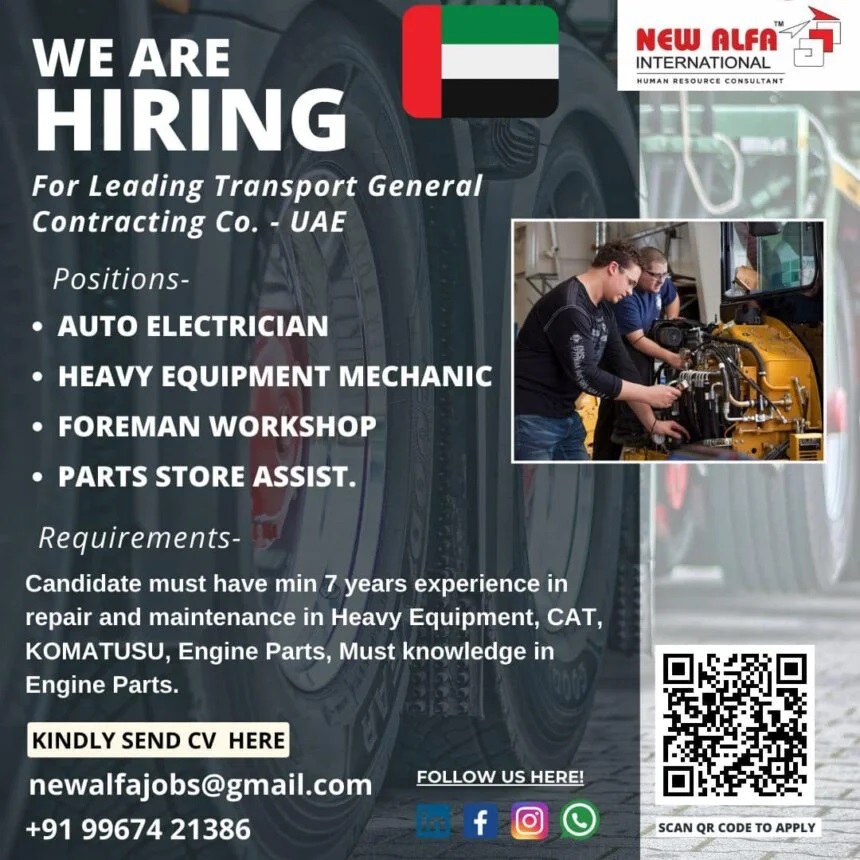 Candidate must have Min. 7 years experience in repair and maintenance in Heavy Equipment, CAT, KOMATUS, Engine Parts, Must knowledge in Engine Parts.