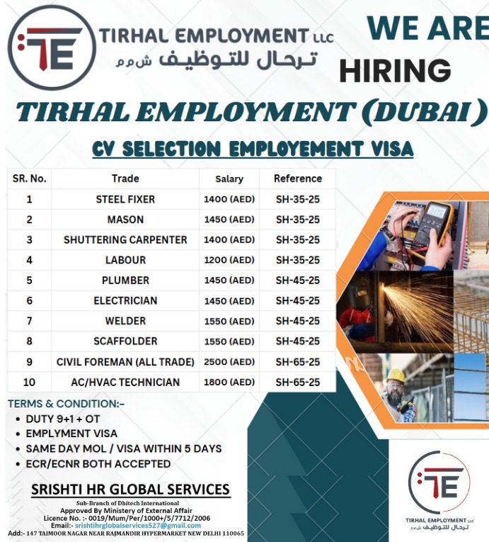 Send CV to: srishtihrglobelservices527@gmail.com
