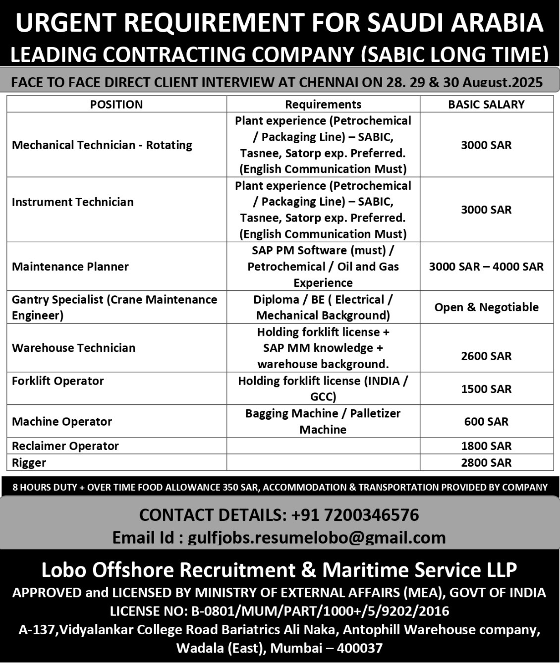 Send CV to : gulfjobs.resumelobo@gmail.com