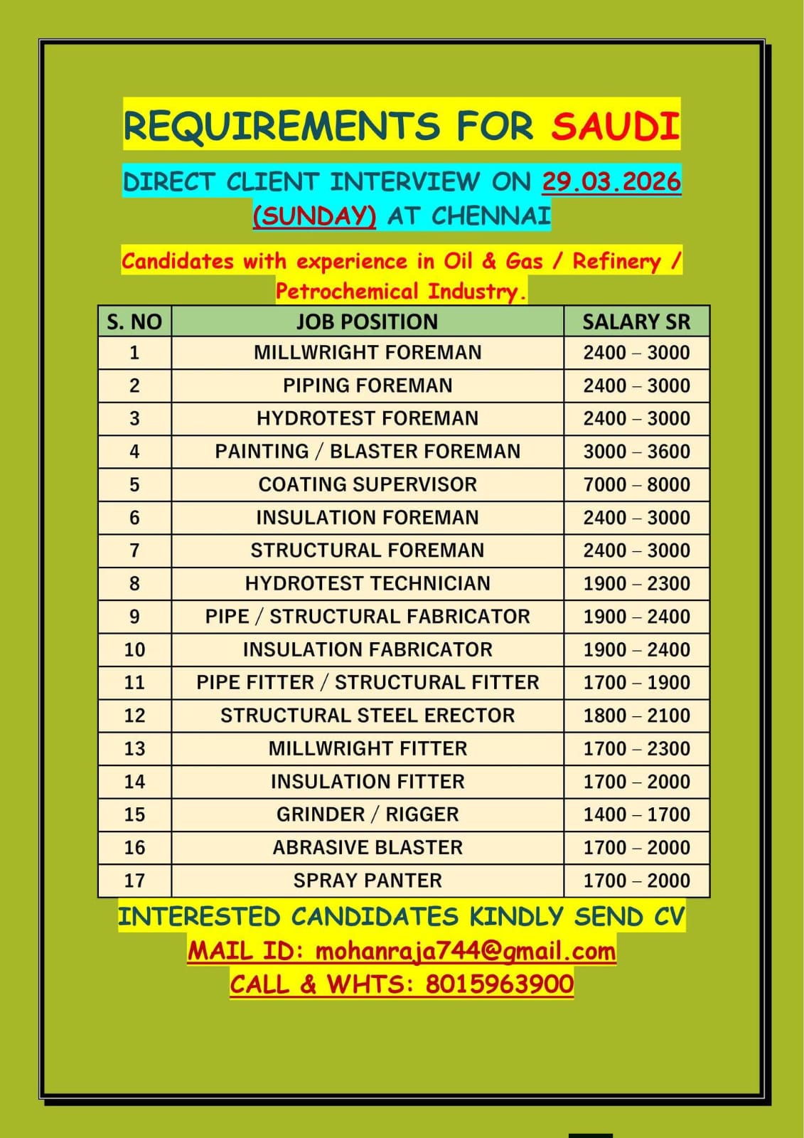 Send CV to: mohanraja744@gmail.com