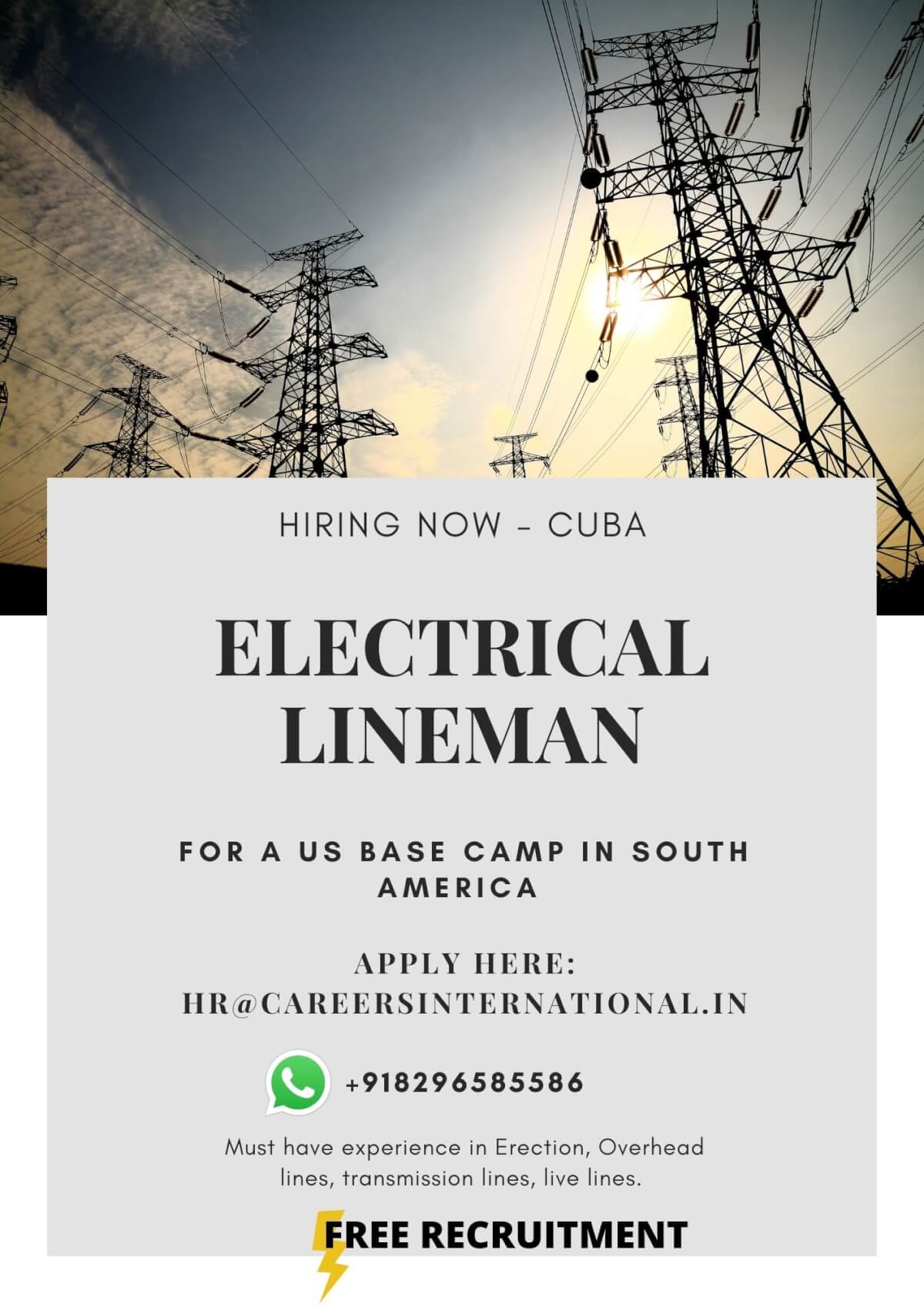 Electrical lineman job vacancy in South Ameria, Cuba