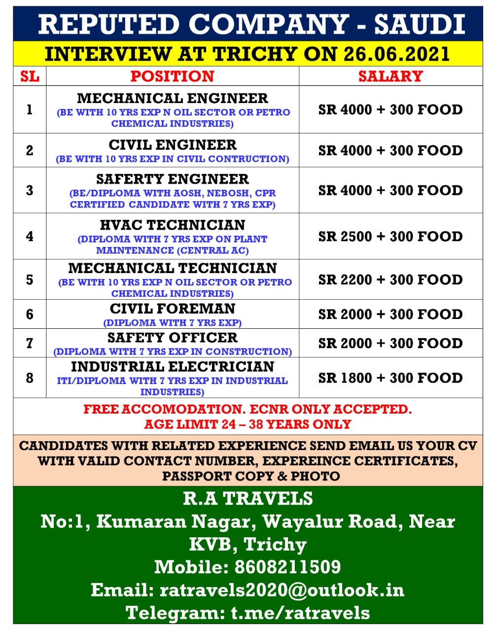 Saudi arabia job vacancy for indian - A reputed company