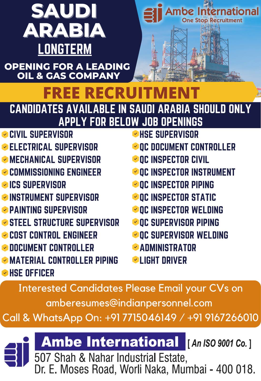 Free visa jobs in Saudi Arabia 2021 - Oil & gas company