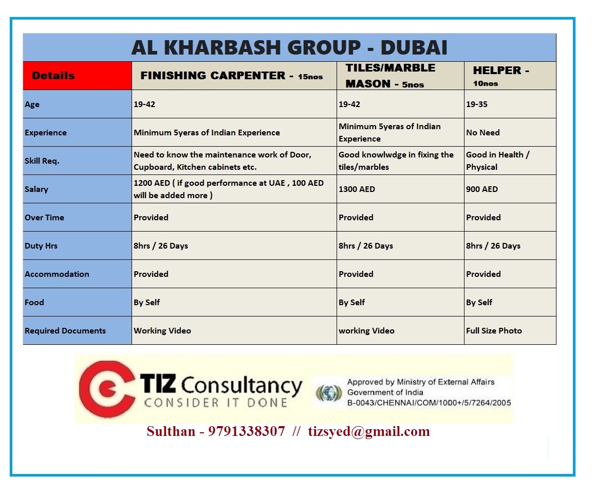 | Finishing carpenter | 15 | 1200 AED |