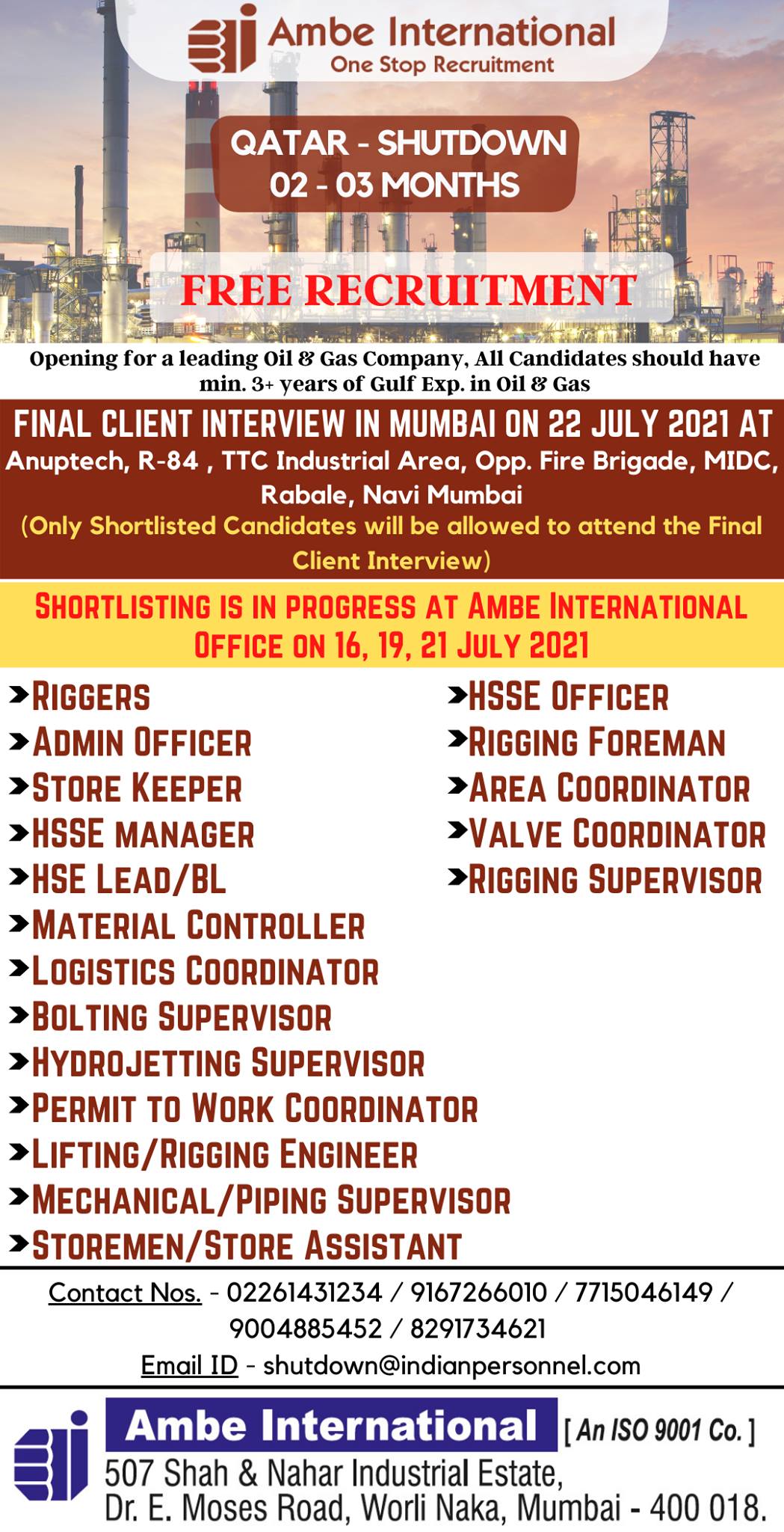 Gulf shutdown jobs interview in mumbai 2021 - Free recruitment
