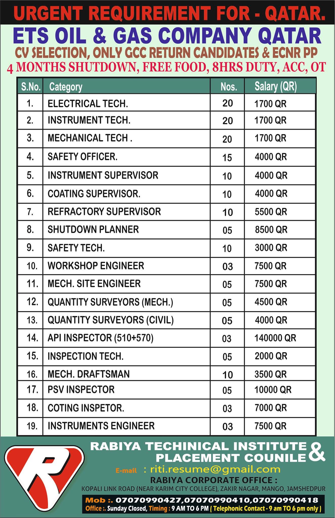 Energy technical services jobs - Urgent requirement for Qatar