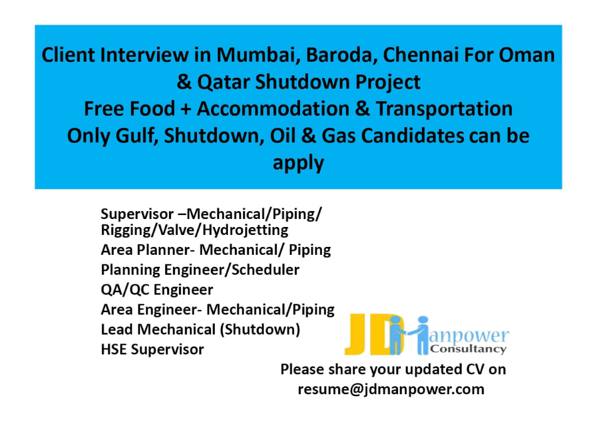 Gulf shutdown jobs interview in Mumbai, Chennai, Baroda 2021