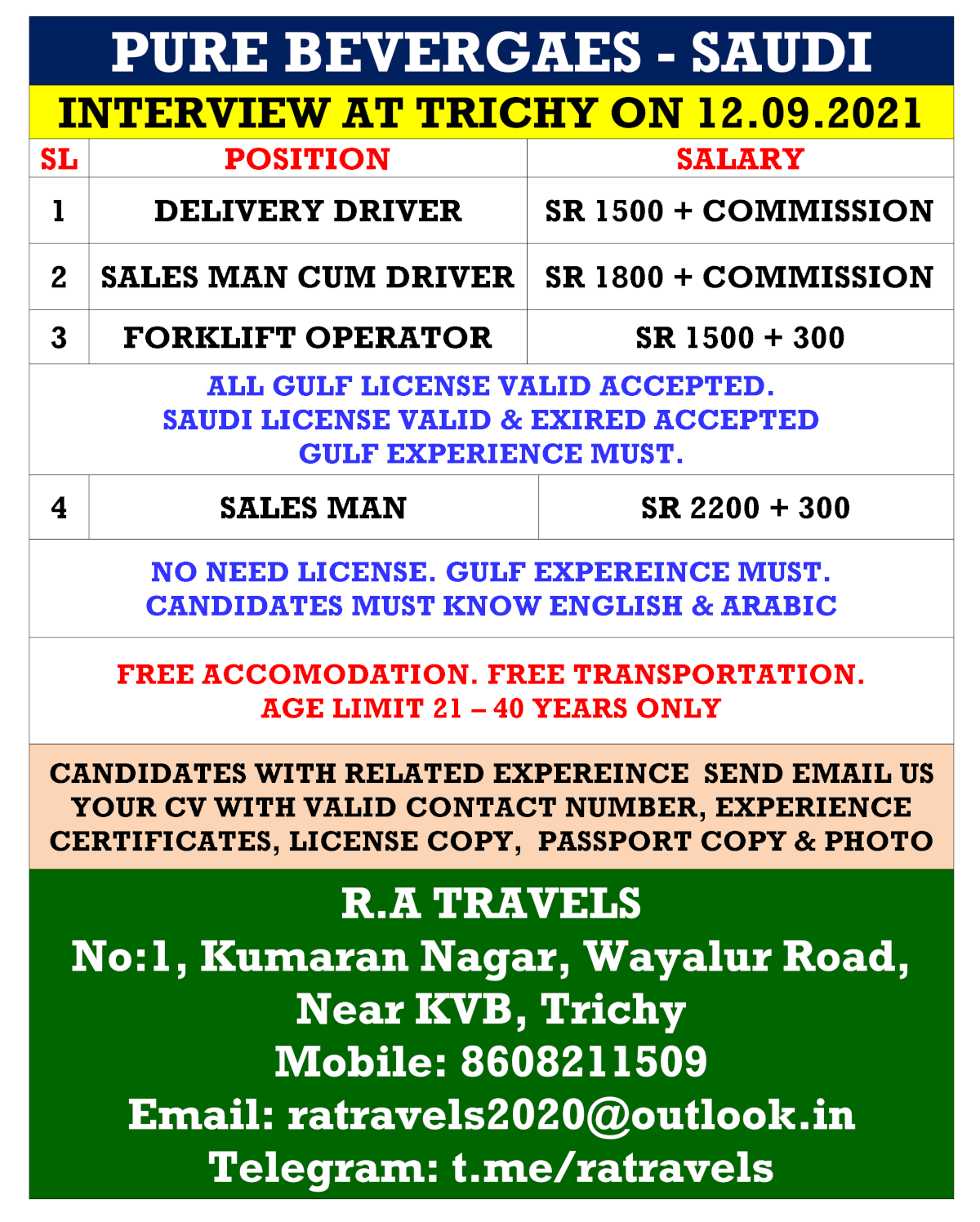 Pure beverages company Saudi Arabia jobs - Walk in interview