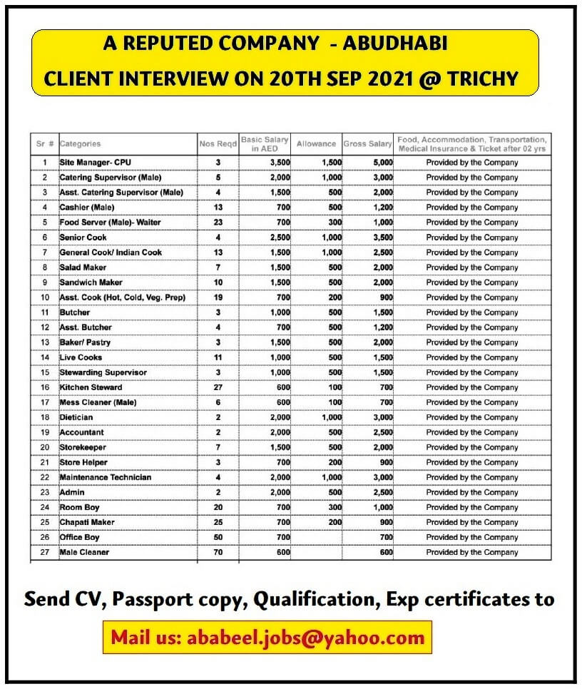 | Assistant catering supervisor (male) | 4 | 1500 AED |