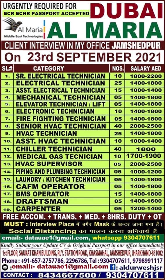 | Electrical technician | 25 | 1400 - 1800 AED |