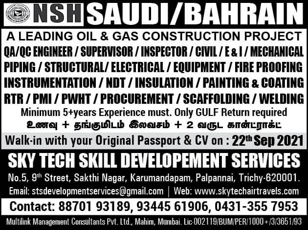 NSH Bahrain & Saudi vacancy 2021 - Oil & gas construction project