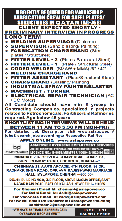 Jobs in Qatar for Indians - Workshop fabrication crew for steel plates/Structures