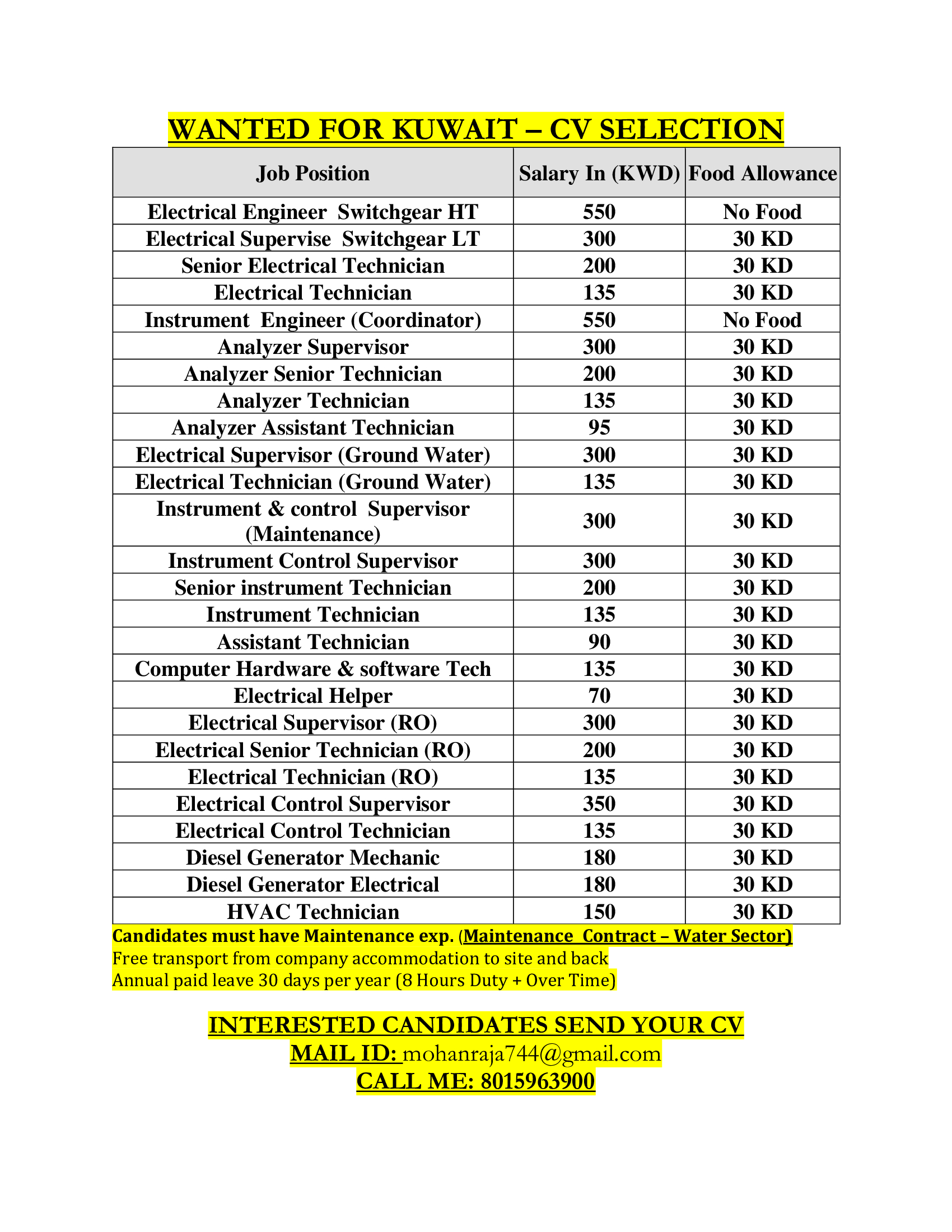 Electrical supervisor (ground water) | 300 KWD | |