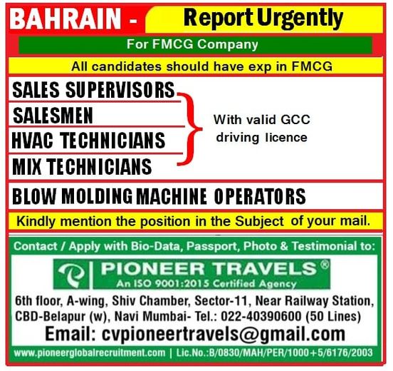 Bahrain job vacancy 2021 for indian - FMCG company