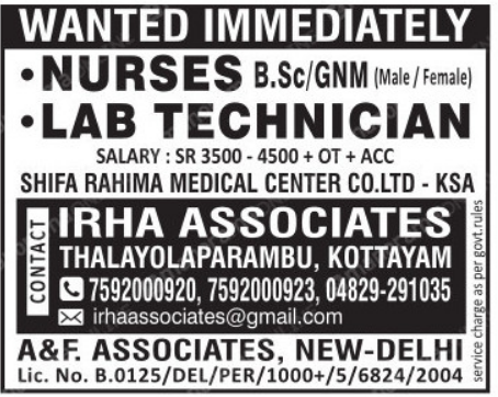 | Nurses B.Sc/GNM (male/female) | 3500 - 4500 SAR | |