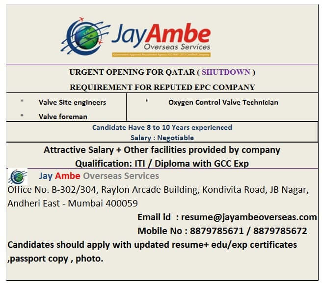 Disclaimer:- GCCWALKINS have no involvement in any recruitment process, This website just sharing job vacancies & interviews from various sources. Applicants are advised to research the bonafides of the prospective employer independently. We do NOT endorse any requests for money payments and strictly advice against sharing personal or bank related information. If you suspect any fraud or malpractice, email us at gccwalkins@gmail.com