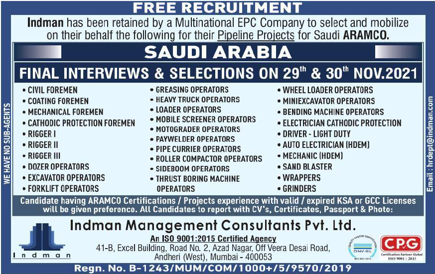 Indman consultants gulf jobs 2022 - Free recruitment to saudi arabia