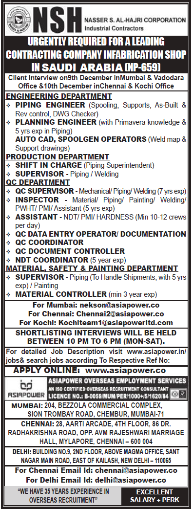 | Inspector - material/piping/painting/welding/PWHT/PMI/assistant | ||