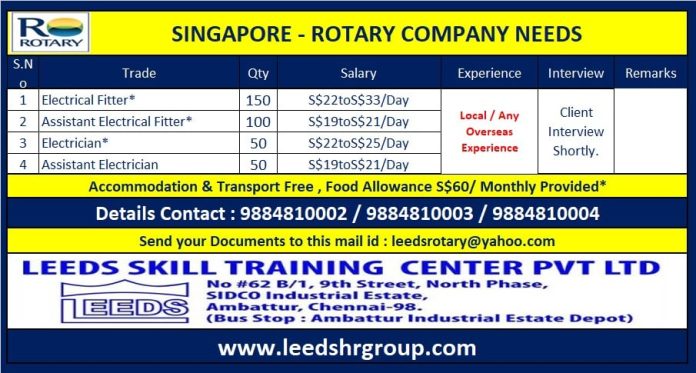 | Electrical fitter | 150 | 33 SGD per day |