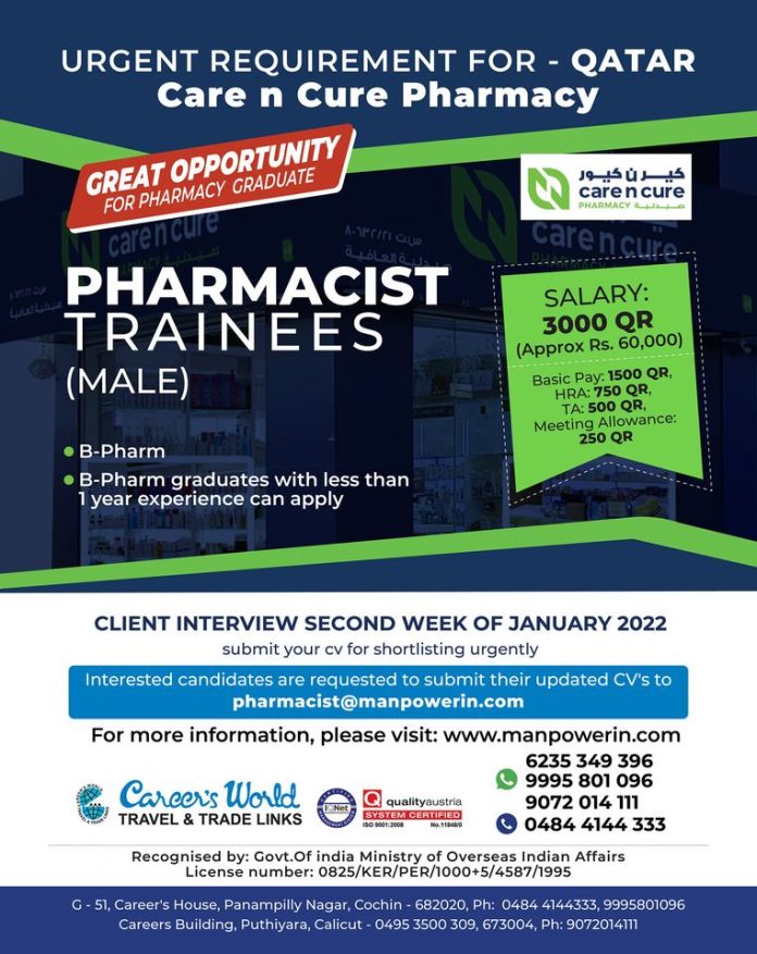 Fresher trainee pharmacist jobs in qatar - Care N Cure pharmacy