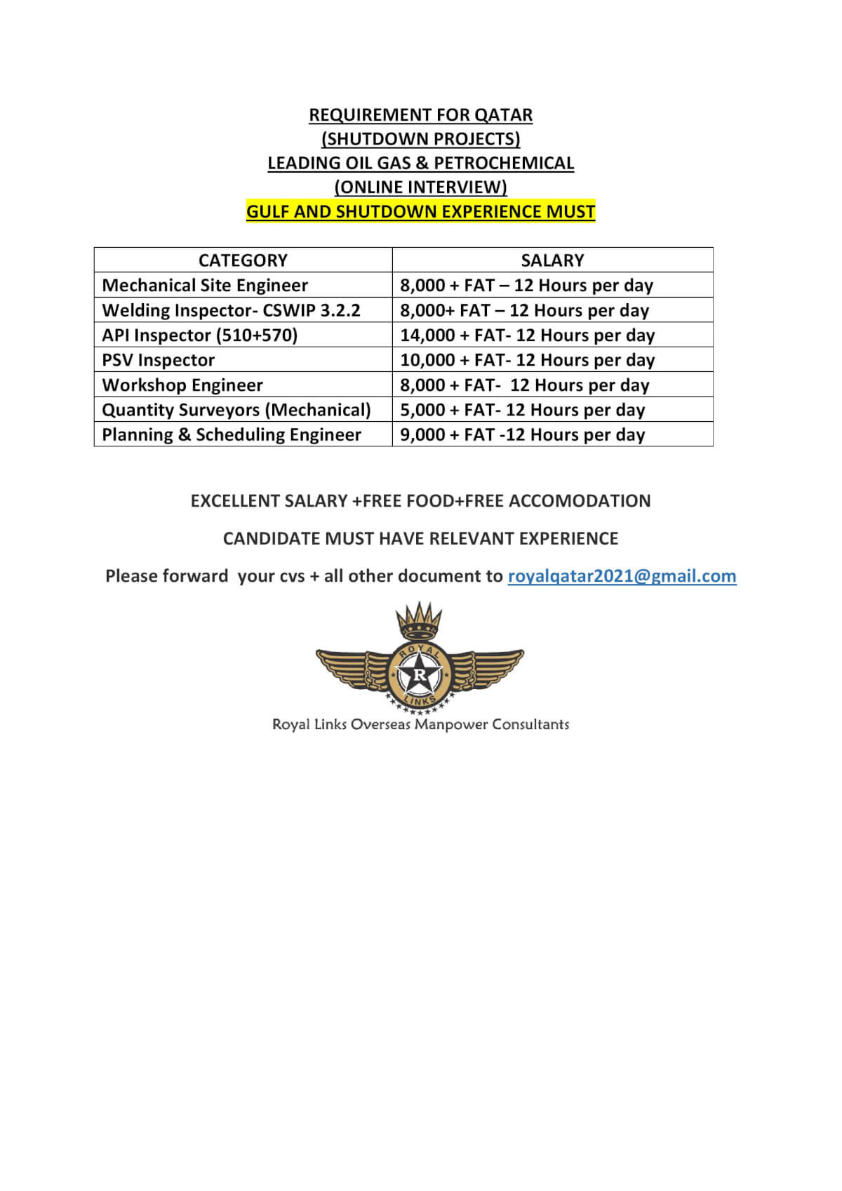Recruitment to shutdown project in qatar