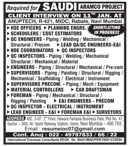 | Supervisors - piping / painting / structural / rigging / mechanical / scaffolding / electrical / instrument | ||