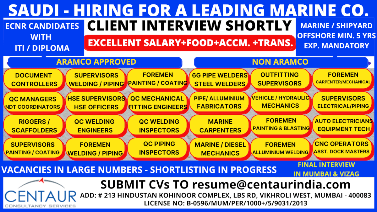 Marine/Shipyard jobs in Saudi Arabia - Urgent hiring
