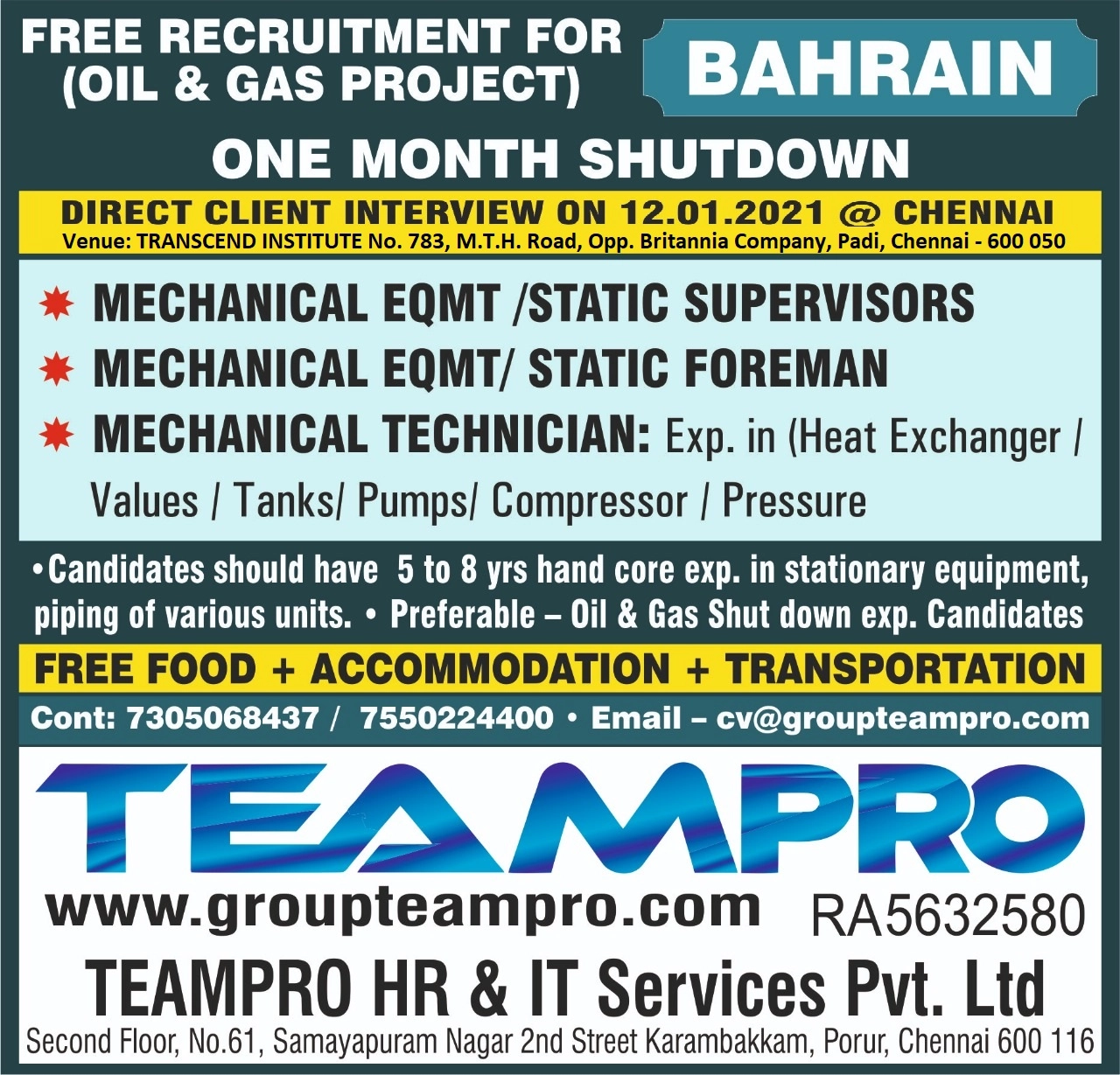 Free recruitment to Bahrain - Oil & gas project