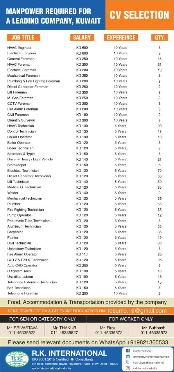 Plumbing & fire fighting foreman | 9 | 200 KWD |