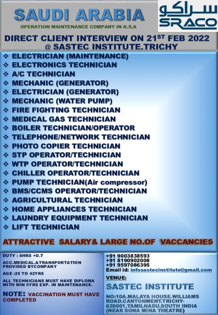 SRACO Company Jobs in Saudi Arabia - Large recruitment