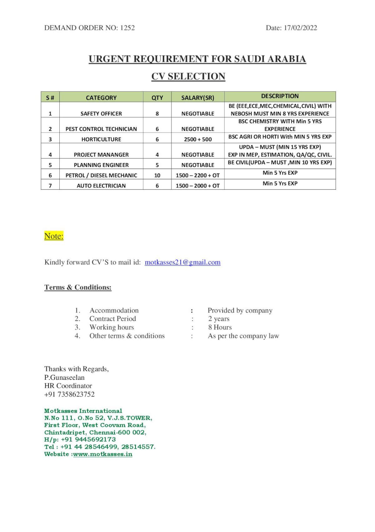 Urgent requirement for Saudi Arabia