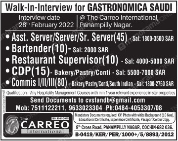 Walk-in-interview on 28th February 2022 at The Carreo international, Panampilly nagar, Cochin