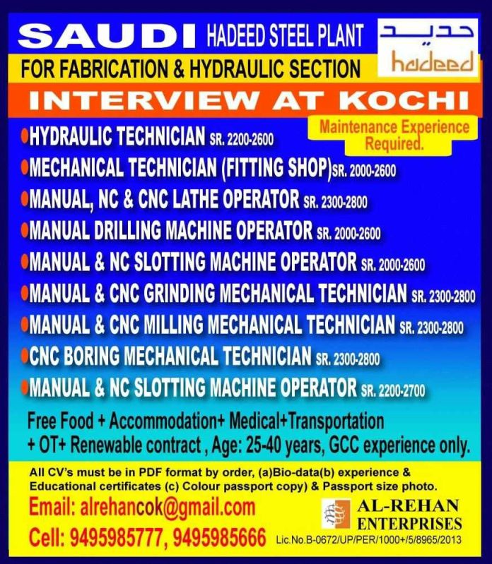 Hadeed steel plant vacancy - Fabrication & hydraulic section