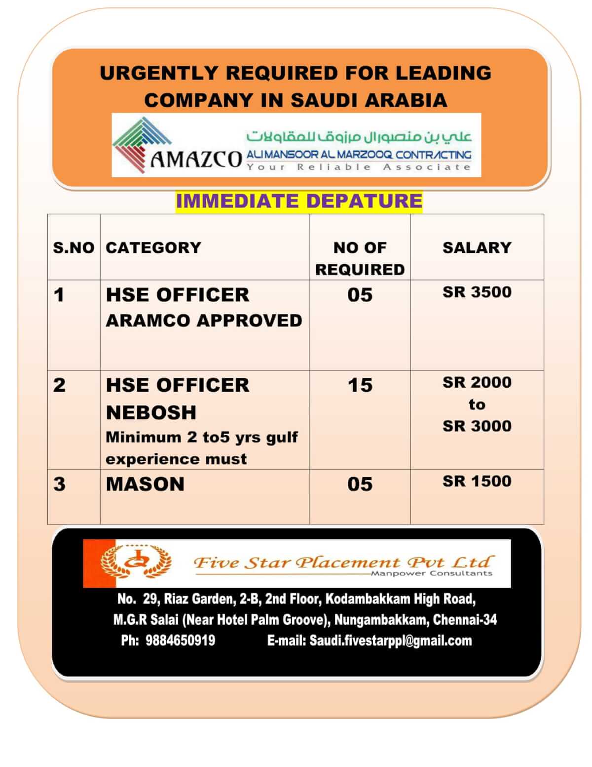 | HSE officer (Aramo approved) | 5 | 3500 SAR |