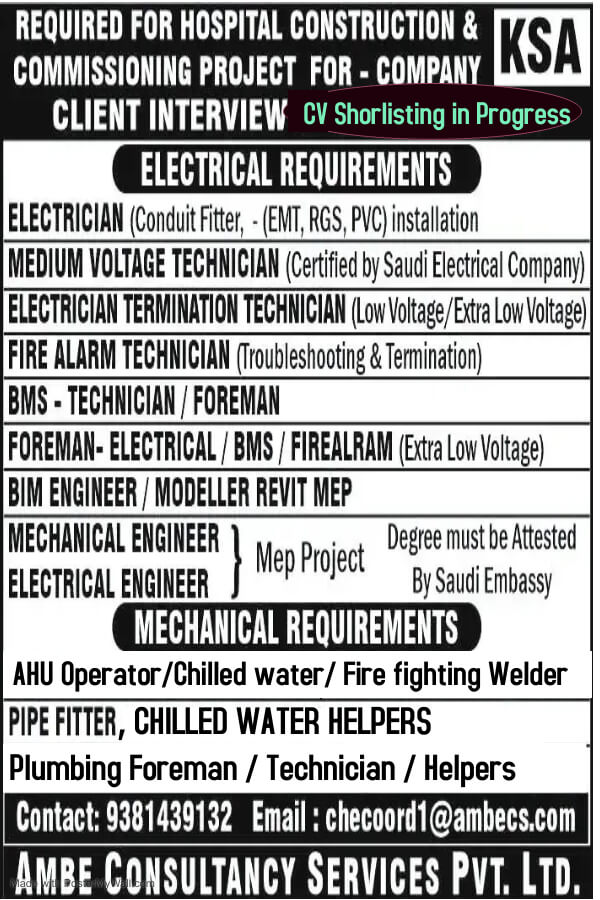Saudi arabia job vacancy for indian - Hospital construction & commissioning project
